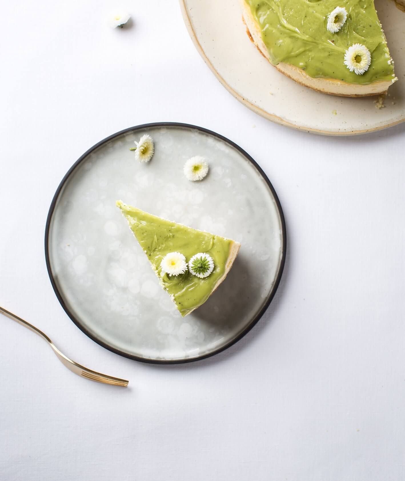 Białą czekoladę i śmietankę roztapiamy w kąpieli wodnej – co jakiś czas mieszamy rózgą kuchenną. Dodajemy sproszkowaną matchę i energicznie mieszamy, by nie powstały grudki. Polewą dekorujemy wierzch schłodzonego sernika.